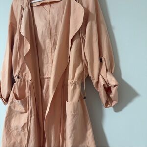 Chic peach trench coat by love tree. Features a relaxed fit and stylish design. Ideal for layering.