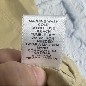 Preowned condition. Tan lightweight long jacket with waist pull strings and bottom pull string. Also deep l hood and two pockets in the front. This has a zipper and button closures. Photos contain measurements. This comes from a smoke free home and will be mailed same business