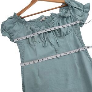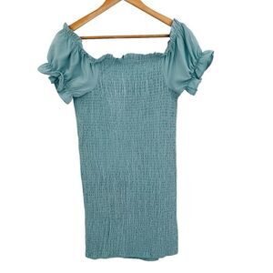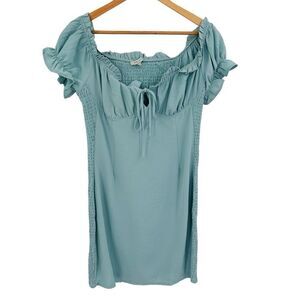 Love Tree seafoam green blue peasant style mini dress size large. Excellent preowned condition. Smocked stretch back see photos for measurements and fabric content
