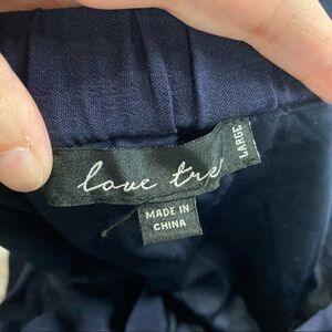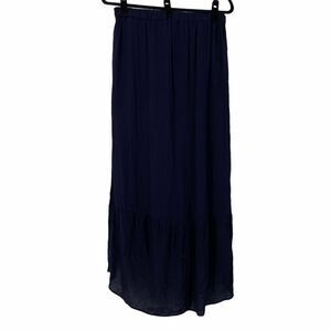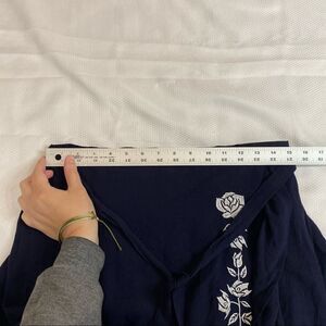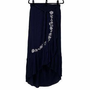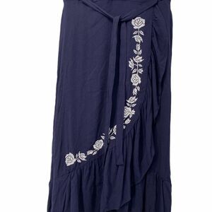 Love Tree Navy Blue White Floral Embroidered Skirt with front tie and side opening slit. Size large with measurements in the pictures. Gently used condition with no rips or stains.