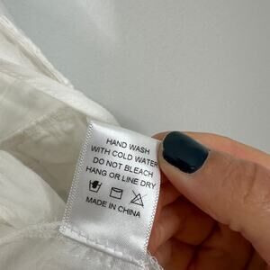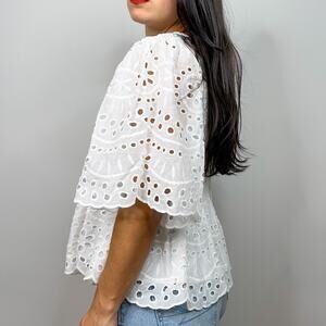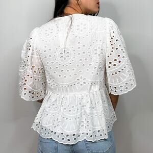 Love Wednesday White Eyelet Tie Front Flutter Sleeve Blouse. Cinched at waist. Three bows to tie at open front. Lined back.