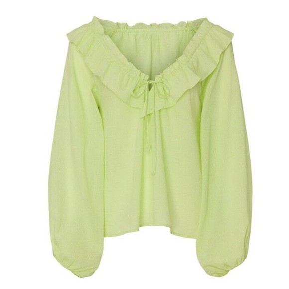 Precious citron green ruffle blouse from Love, Whit by Whitney Port. Features a wide scoop neck with ruffle and tie detail and balloon sleeves. 100% cotton.