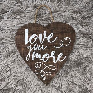 This wooden heart shaped sign says “Love you More” and has a string for hanging. Please ask questions and make offers! I will try to get measurements up soon, let me know if you would be interested in the dimensions!