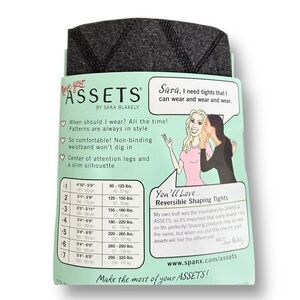 Occasion: Workwear, holiday parties, date night, fall & winter layering, stylish events, office-to-evening looks Y2K Revival, Dual Style, Power Shaping, Textured Tights, Statement Legs, Curve Confidence Description: Turn heads both ways with these Love Your Assets Flipside Diamond tightsreversible shaping with tummy control, thigh smoothing, and a trendy diamond pattern. Two looks in one for sleek style and confidence. - Meas. (approx.): * Refer to size chart in photos for measurements. - Material: 75% Nylon, 14% Polyester, 11% Spandex Features: * Reversible design with diamond pattern for stylish versatility New with Tags. All items are carefully photographed and stored in clear poly bags in a climate-controlled, pet-free, child-free, and smoke-free facility. If you have any questions or need additional information, please feel free to contact us.