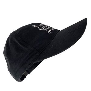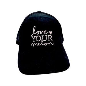 Black hat with white embroidered Love Your Melon logo. Adjustable strap in back of brown leather with signature heart on distressed gold-tone clasp.