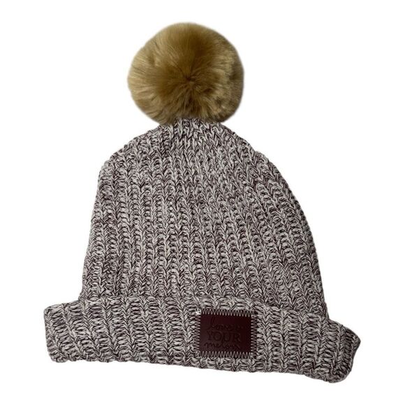 Love Your Melon Maroon/White Knit Fur Removable Pom Pom Beanie Hat. Chic knit beanie by Love Your Melon. Features a removable soft maroon faux fur pom. Ideal for cozy winter style.