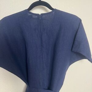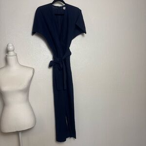 Elevate your wardrobe with this chic navy jumpsuit. Featuring a stylish tie waist, it's perfect for any occasion. Linen cotton. Wrapped Vneck. Measurements laying flat are approximately Waist- 16 Inseam- 27 Chest- 20