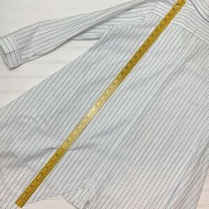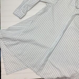Cute crisp button front tunic with pockets! Uneven hem flares out and this tunic has long sleeves. See photos for approx measurements. EUC.