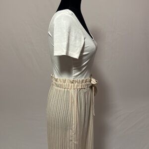 Round neck, short-sleeve, elastic around waist and belt, with pockets.