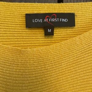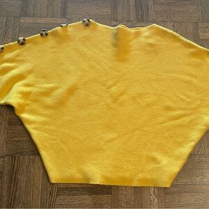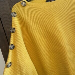Chic mustard ribbed sweater Features stylish button accents on the shoulder. Cozy lose fitting sweater with tapered bottom. Sleeves are wide and loose at the shoulders and gradually taper to a tighter fit at the wrist.