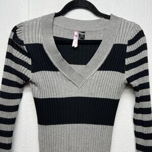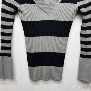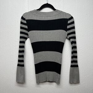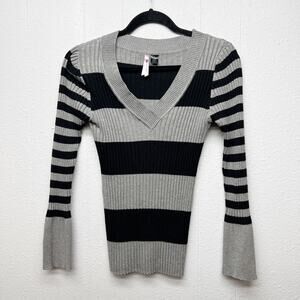 Love by Design pullover colorblock sweater in black & gray. V-neck. Long sleeves with bell cuffs. Ribbed. Stretch. Fitted. In good used condition. No stains, tears or holes.