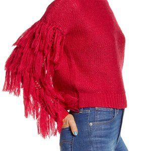 Tassels of fringe deliver dramatically fluffy texture to this cozy scarlet sweater. New with tags Love by Design fringe sleeve sweater in red, fits true to size. Women's size small available (0-2).