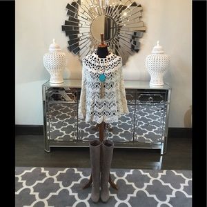 Gorgeous Love by Design Knit Poncho. Beautiful off white Crochet design. Drapes and flows effortlessly. Perfect for summer evenings. Can throw over your favorite outfit for instant flare!