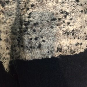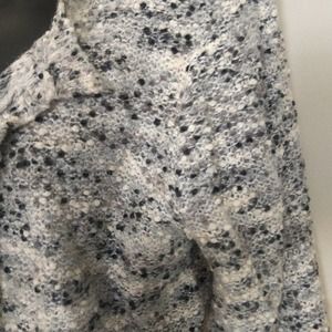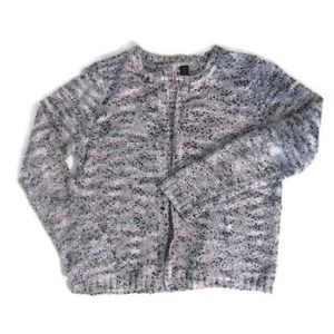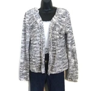 EUC Love by Design Sweater Knit Cardigan. Open Front, crochet trim, soft textured material, white, black, gray colors.