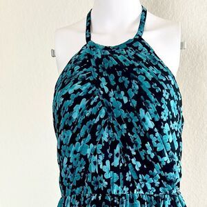 In excellent used condition Love by Theia A-Line chiffon backless mini dress. Pleated bodice and backless silhouette with back zip and hook closure.