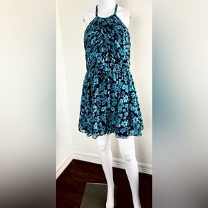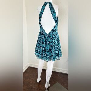 In excellent used condition Love by Theia A-Line chiffon backless mini dress. Pleated bodice and backless silhouette with back zip and hook closure.