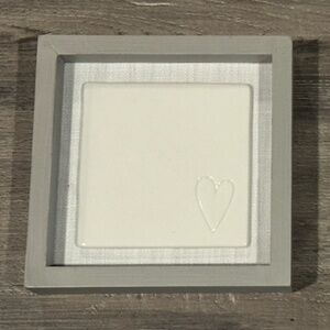 This stunning piece of wall art from the Quiet Moments collection features a heart, all the more lovely because of the simple design. The wall art has a ceramic square mounted on linen lined material and then framed in lovely beech wood. The only design on the ceramic is the simple heart in the lower corner and this simple design draws your eye to the heart and its message of love. The heart wall art measures 6" square and comes with a keyhole opening in the back for convenience in immediate hanging.