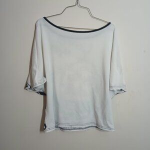 I'm not sure what the fit of this shirt is supposed to be. It appears rather relaxed, so I'm not sure if it's stretched out or if that's the design (see pictures for reference). No stains, rips, or other major defects noted. This is considered used clothing, and I'm only one person, so it may not be perfect.