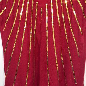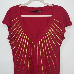 Adorned with red and gold sequins, this Love Moschino tunic exudes opulence and sophistication. The V-neck design adds a touch of allure, making it a perfect choice for special occasions or when you want to make a fashion statement.