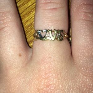 Here is a ring that spells out the word love. Everything is gold except the o which is a silver heart