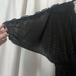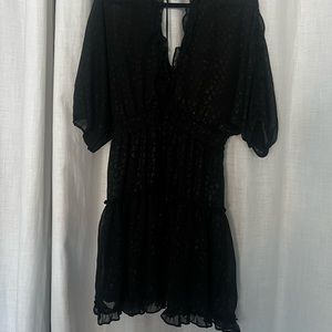 Black sheer dress with lining. Gold detail on dress shown in photos. Low cut front and back. Front has clasp for closure. Back ties at the top. I’m 5’9” and it goes a little below the middle of my thigh. Never been worn. Super cute! Perfect holiday dress! Purchased from Vici Dolls.