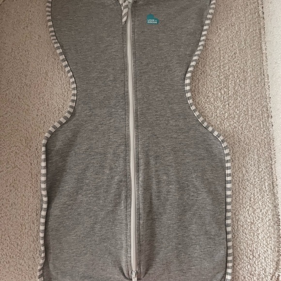 Used once. Soft gray swaddle with a zipper. Features stylish striped trim. Ideal for comfort.