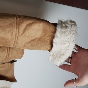 Love tree faux fur lined, faux suede moto jacket, women's size large. Tan and cream color, silver metal detail, no flaws NWT.