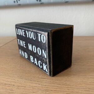 Pre-owned, intentionally distressed and in like new condition. Primitives By Kathy Box Sign, "Love you to the Moon And Back" 4x2.5"