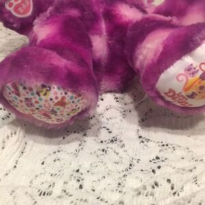 It is a purple and pink plush bear, featuring a "Love, Diana" pattern on its paw pads.
