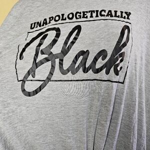 This is a short sleeved shirt by Love J. It is light grey and has a front knot detail. On the chest are the words "Unapologetically Black," printed in black.