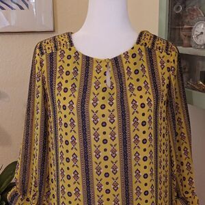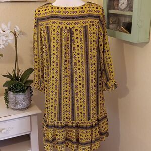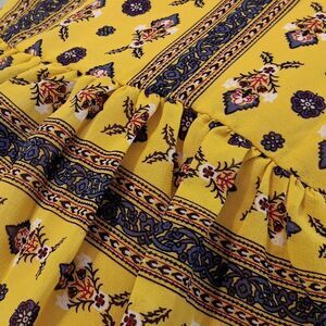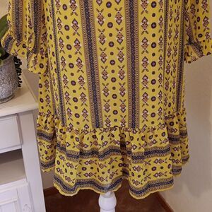 Stylish yellow dress with intricate Asian inspired vertical patterns in a semi-sheer fabric, iver a full lining. Shift style. Smocked shoulder. Long sleeves with ruffled cuffs. Size 8 (no size or content tags, please see measurements) measures 40 at chest, 42 at waist, 46 at hips. 48 at bottom hem. 35 long from shoulder to hem. Pull over. Perfect for a Bohemian look that's comfortable and stunning.