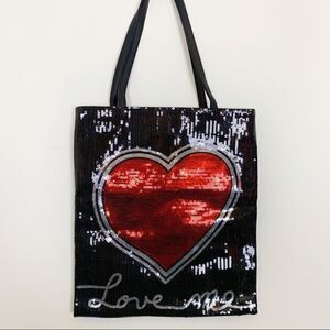Love Me Fashion Sequin Tote Bag, Black/Red/White - Sequin design on the front, PU (Polyurethane) faux leather back, and Polyester lining. Zippered closure, zippered pocket on the back, interior zippered pocket and interior pouch pocket. Length 13 3/4”/ Height 15.5”/ Strap Length 22 3/4” with 10” drop *Boutique item, new with packaging.