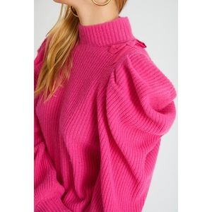 LSF’s Potter Pullover brings the drama, making its entrance with a ribbed knit texture and decorative cotton voile bow shoulder details. This mock turtleneck sweater is impossibly soft. Long puff sleeves. Bold electric pink color. 100% cashmere.