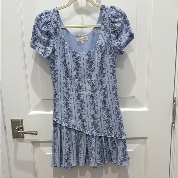 Charming blue dress with floral pattern. Features short sleeves and a scoop neckline. Perfect for casual outings.