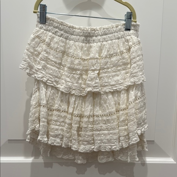 This elegant white lace skirt is perfect for any occasion. Its delicate design adds a touch of sophistication to your wardrobe. The tag label is missing.