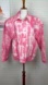 LoveShackFancy tie dye jacket. Pink and white tie dye pattern. Color is hibiscus hand dye. Front button closure. Collar. Front patch pockets. Dropped shoulder. Long sleeve with snap cuffs. Quilted fabric. Heavy cotton. No stretch. Stiff. Oversized fit. Worn and in great condition. A couple dark spots on end of collar and front (photo 14). Spot that could either be dye or stain on front, bottom hem (photo 13). Photo 12 shows intentional dye lines.