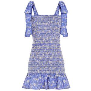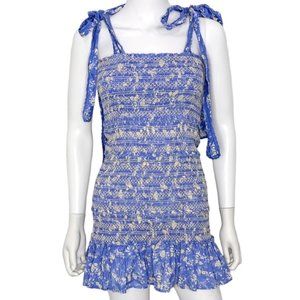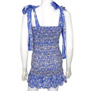 LoveShackFancy Belle Smocked Tie Straps Cotton Mini Dress Blue Jay Floral Print