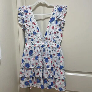 LoveShackFancy, authentic new with tags. “Bennett” Mini Floral Tiered, V-Neck, Ruffle Dress. Size Large, White with Blue and Red floral pattern.