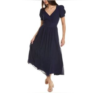 Hutchinson Silk-Blend Dress in midnight Approximately 52in from shoulder to hem Design details: Silk cotton blend crepe fabric, midi, elastic puff sleeves, sheer back, V-neck Side seam zipper Shell: 70% Cotton 30% Silk Lining: 100% Cotton