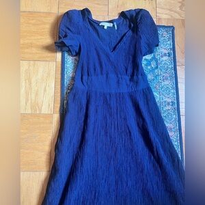 Chic and sophisticated midi dress. Features a deep blue hue. Perfect for any occasion.