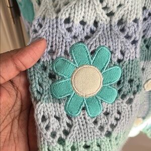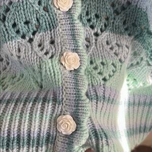 Stylish knitted cardigan with floral details. Features a button-up front. Perfect for layering.