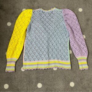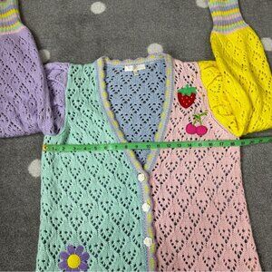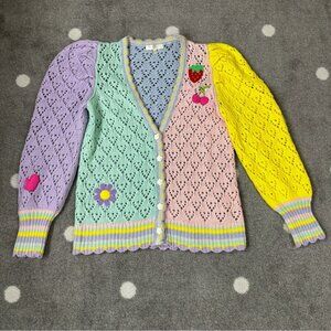 Wrap yourself in the new Loveshackfancy Brody Oversized Cardigan, the perfect cozy layer in lightweight, color-blocked pointelle knit and top-applied cherry, flower, heart and strawberry patches. This girly boyfriend sweater has a deep v-neck, scalloped edges, signature rose buttons down the front and dramatic shaped mutton sleeves that narrow to tall ribbed cuffs