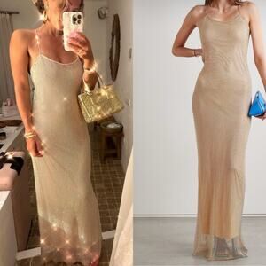 LoveShackFancy gold Calvert beaded rhinestone mesh maxi Dress.