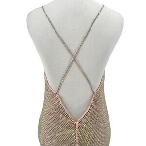 Dazzle in this stunning LoveShackFancy Calvert gown, featuring shimmering gold rhinestone mesh overlay and delicate criss-cross back straps. The sheer silhouette is lined for subtle coverage while maintaining a sultry, ethereal look. Perfect for destination weddings, summer soirées, or glamorous nights out.