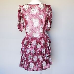 LoveShackFancy Cata Floral Ruffled Silk Mini Dress in wonderful condition. Flocked silk-blend chiffon, puff short sleeves, tiered ruffled skirt, floral print, crew neck, hidden side zipper, semi-sheer at bodice - skirt is fully lined, raw frayed hems at ruffles.