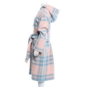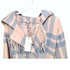 Crafted in a soft wool blend (85% wool, 15% nylon), this full-length coat features a blush pink and blue plaid pattern with fringe detailing along seams and hem. Novelty porcelain floral buttons embellish the front and sleeves for a signature romantic touch. Designed with a hood and wide waist belt for versatile styling.