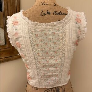 Charming cream blouse with floral print. Features lace-up front and delicate details. Ideal for a feminine touch.