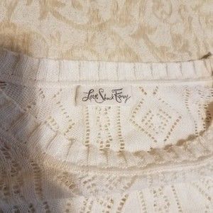 Elegant long sleeve top with ruffle details. Intricate knit pattern. Perfect for layering.