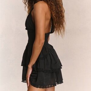 Chic black dress with halter tie. Smocked bodice and tiered skirt. Lace trim detail.