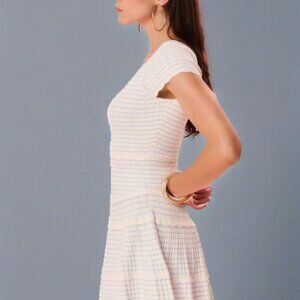 Sunshine ready in the Elisavette Dress. This charming mini debuts with our best-selling pointelle yarn with a nice stretch and extra soft feel. The dress has stripes throughout with lurex giving this piece our signature shimmer. Beginning with short cap sleeves, the piece has a scoop neckline, scallop details, and a fit-and-flare silhouette.